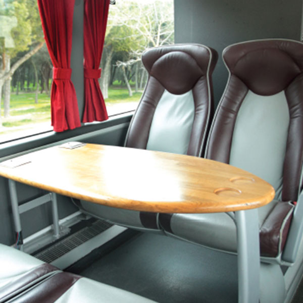 Todos nuestros vehículos disponen de aire acondicionado o climatizador, butaca reclinable, sistemas anti-vuelco, cinturones de seguridad individuales, vídeo o DVD, megafonía, teléfono móvil. Y tenemos muchas opciones para personalizar el autobús, con butacas reclinables, mesas, cuarto de baño, nevera… ¿Que deseas? Lo tenemos.