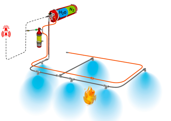 El agua nebulizada tiene un excelente efecto de ahogo y enfriamiento. El sistema siempre está activo, sin necesidad de alimentación eléctrica para su activación ni para la supervisión del sistema. Fogmaker ahoga el incendio de forma rápida, pero, sin embargo, tiene un tiempo de vaciado más largo que muchos sistemas de la competencia, lo cual es fundamental para evitar el reavivamiento y tiempo de inactividad. También permite ganar un tiempo valioso para evacuar a las personas.